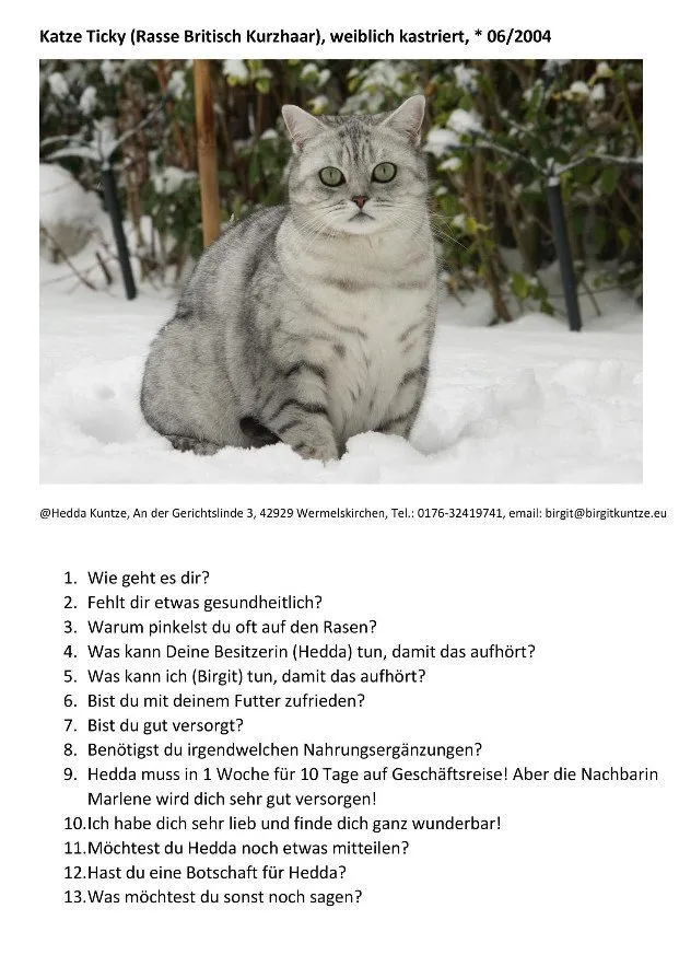 Bei weiteren Fragen oder bei Interesse an einer Tierkommunikation bitte ich dich, mit mir telefonischen Kontakt aufzunehmen!!!